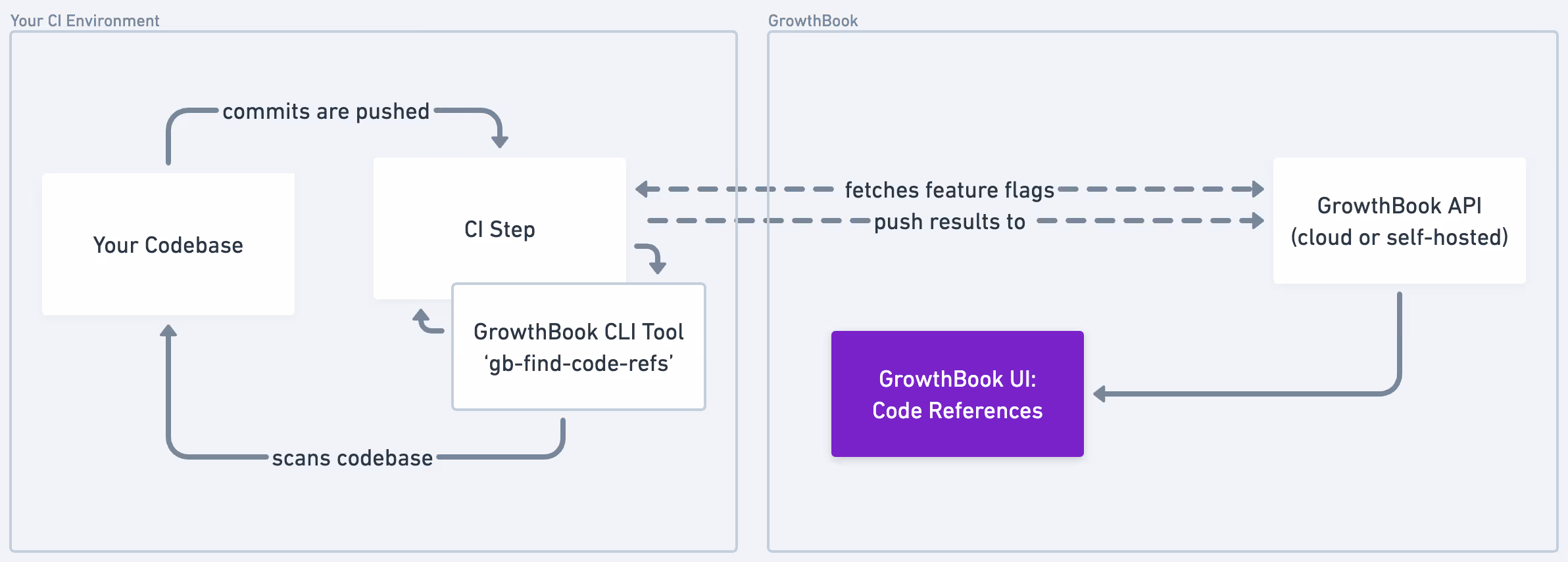 Using gb-find-code-refs, you can create a CI job that will fetch feature flags from GrowthBook, then scan your codebase for those flags using gb-find-code-refs, and finally submit those generated code references back to GrowthBook.