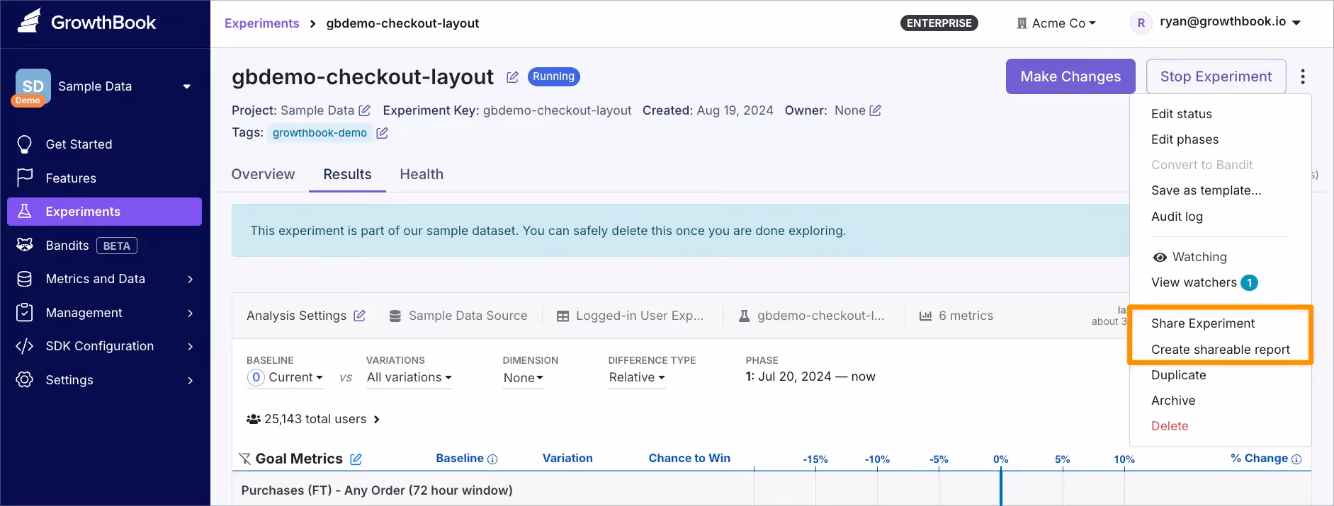Share a real-time, always-updating view of experiment results with stakeholders who need the latest data. Share live updates during sprint reviews to keep teams aligned and make decisions more quickly. No manual updates are required, ensuring everyone has access to the most current insights.