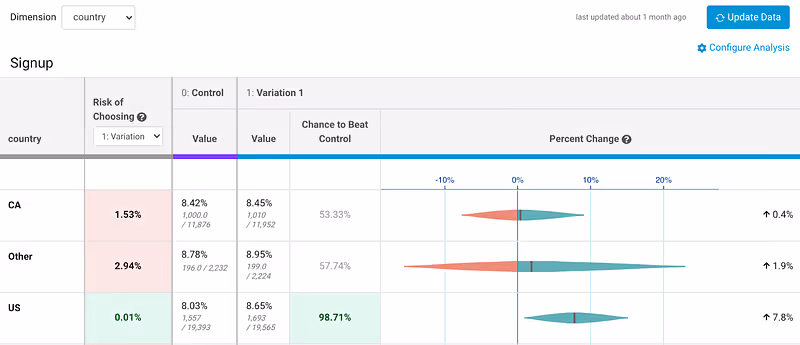Now, when you do a dimensional analysis on the results of an experiment, you can see the full statistical results, with the chance to beat control, risk, and a percent change graph. This is enabled by default when there are fewer than 5 unique dimension values and can be toggled on manually for dimensions with more values.