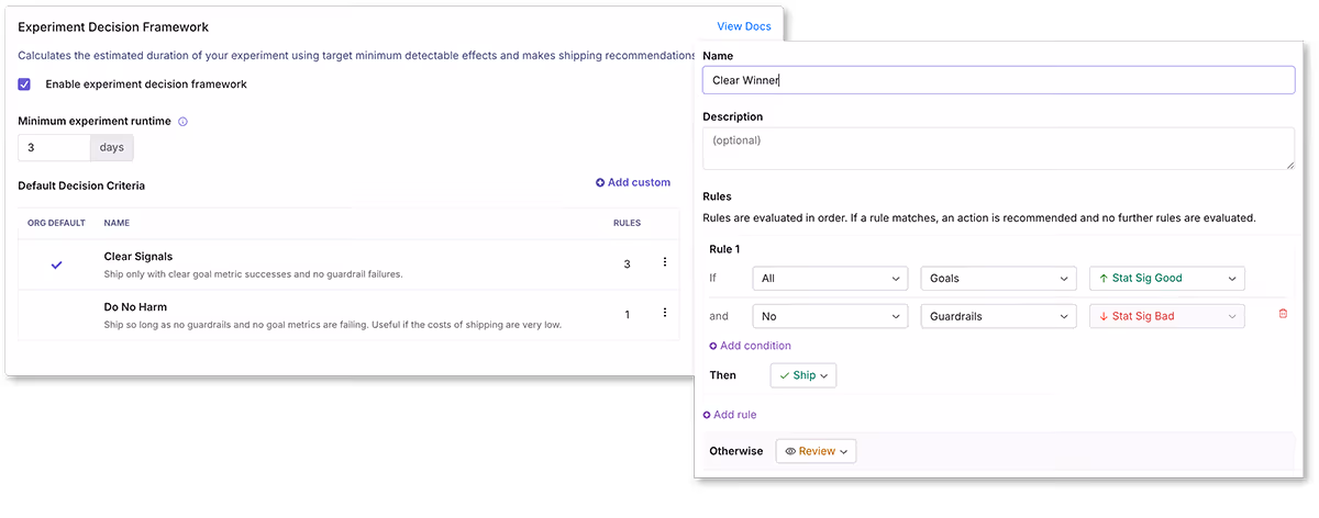 You can now customize the logic that powers our Experiment Decision Framework on a per-experiment basis.