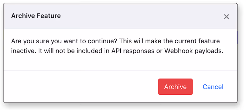 You can now archive features and prevent them from appearing in API and webhook payloads without deleting them. Archived features are also hidden by default in the feature list. This is a great way to remove a feature while keeping the full revision history as areference in case you need it later.