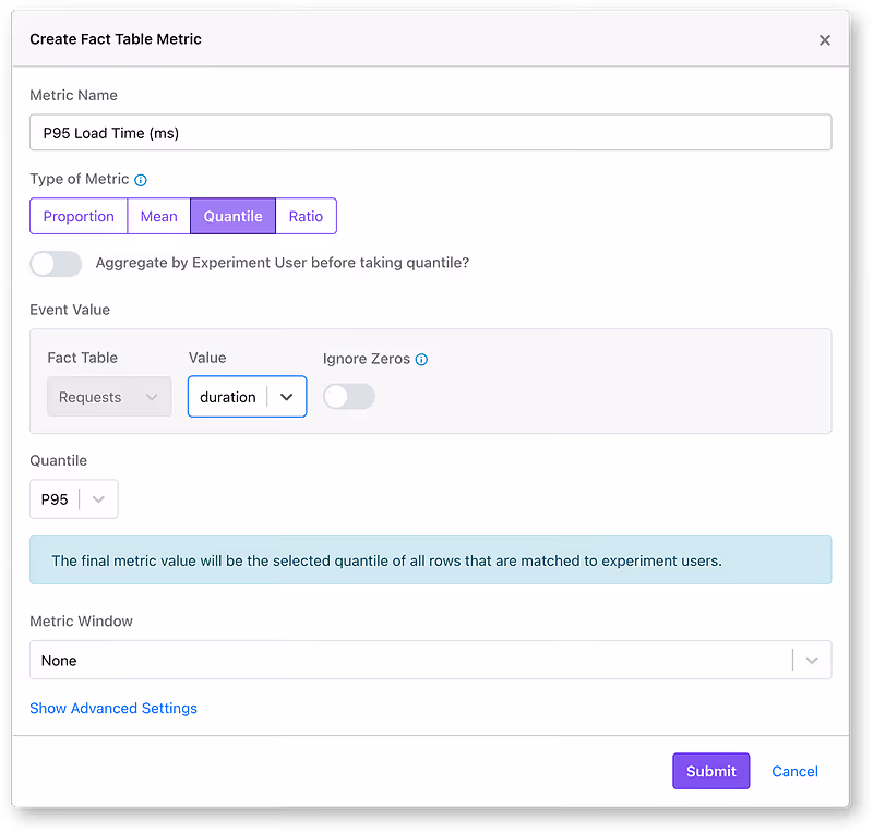 Quantile metrics are built on top of Fact Tables and utilize advanced techniques to keep your SQL fast and efficient while maintaining high accuracy in the statistical results. You can read more about this (including a technical deep dive) in our docs. Quantile metrics are available to all Pro/Enterprise customers and support all data sources except for MySQL and Mixpanel.