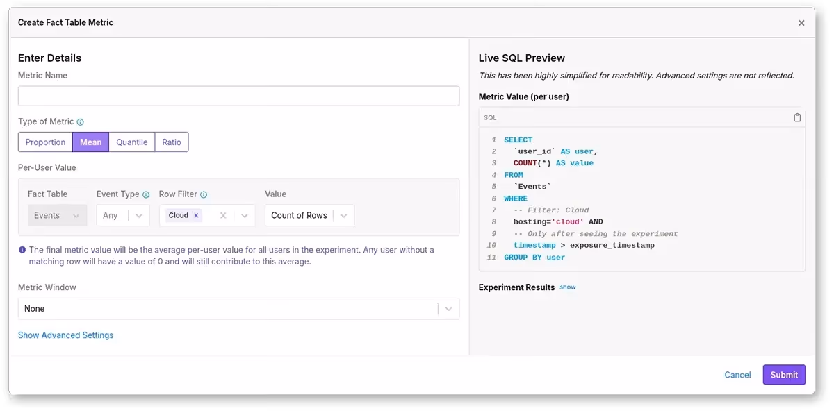Now available when creating or editing fact table metrics, so you can see how metrics behave under the hood in real time.