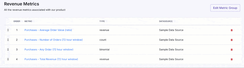 Save and organize groups of metrics so you can streamline experiment setup. Groups are passed by reference so updates will apply to all experiments using the group. You can also adjust the order in which metrics are shown: