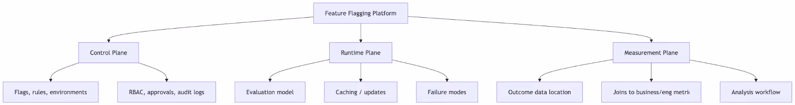 - Runtime plane: How flag definitions propagate, how targeting decisions are evaluated, update models, hot-path dependencies, and outage behavior.