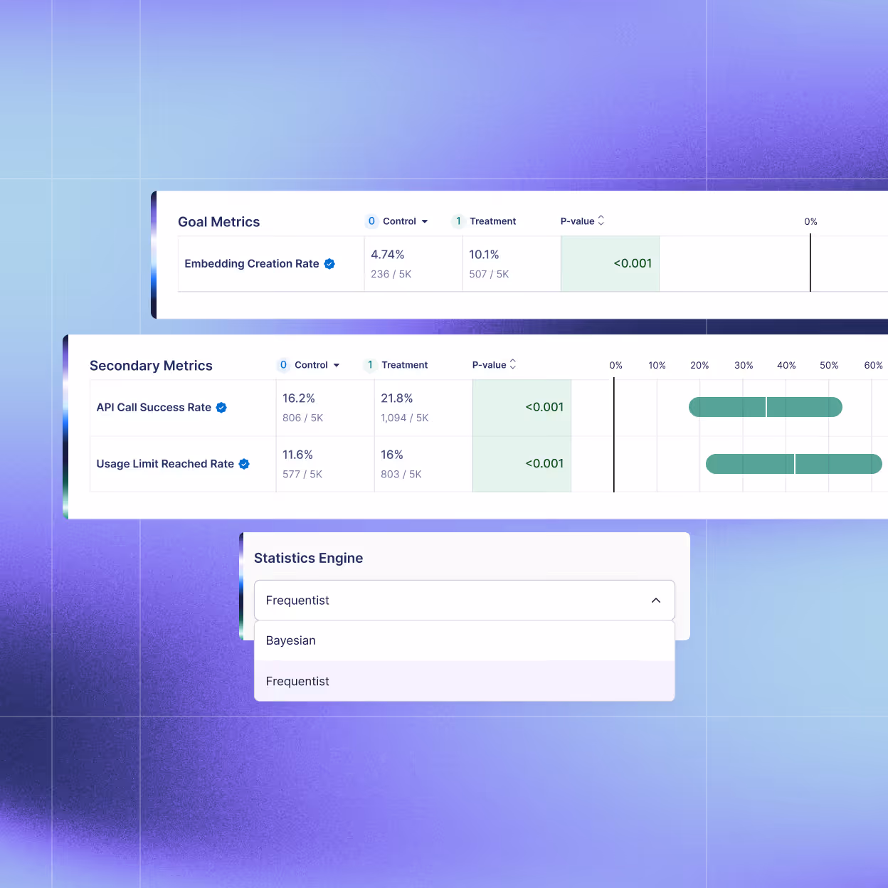 AI assistants are non-deterministic, so the same prompt can produce different outputs across learner types, content domains, and age groups. GrowthBook lets you run controlled experiments comparing prompt variations, model choices, or agent configurations against the metrics that matter: skill completion, session success, retention, and response latency. You can set guardrail metrics on cost and latency so tradeoffs are made with data rather than guesswork. If a new AI feature underperforms or violates safety thresholds, you can roll it back instantly without redeployment.